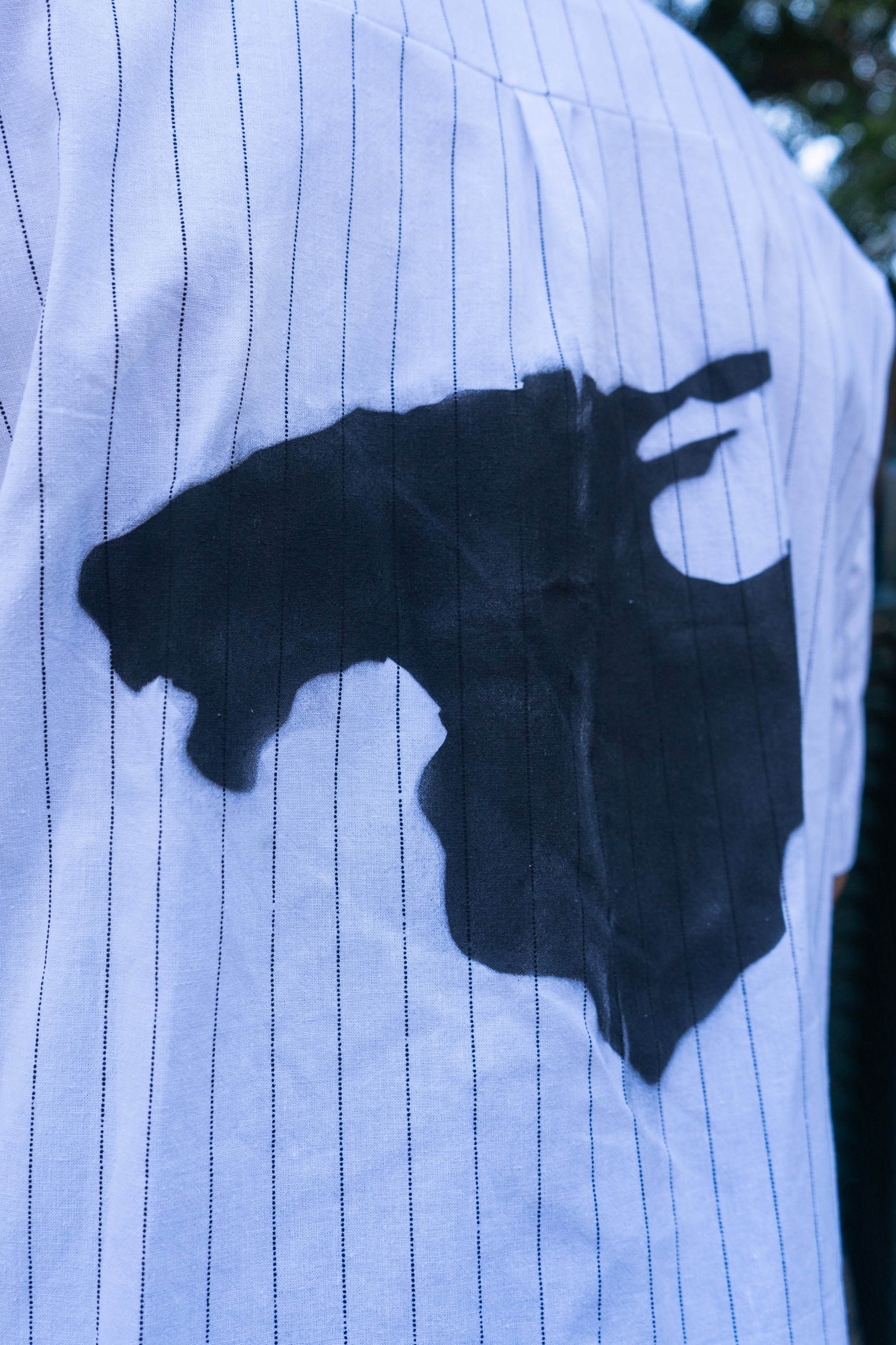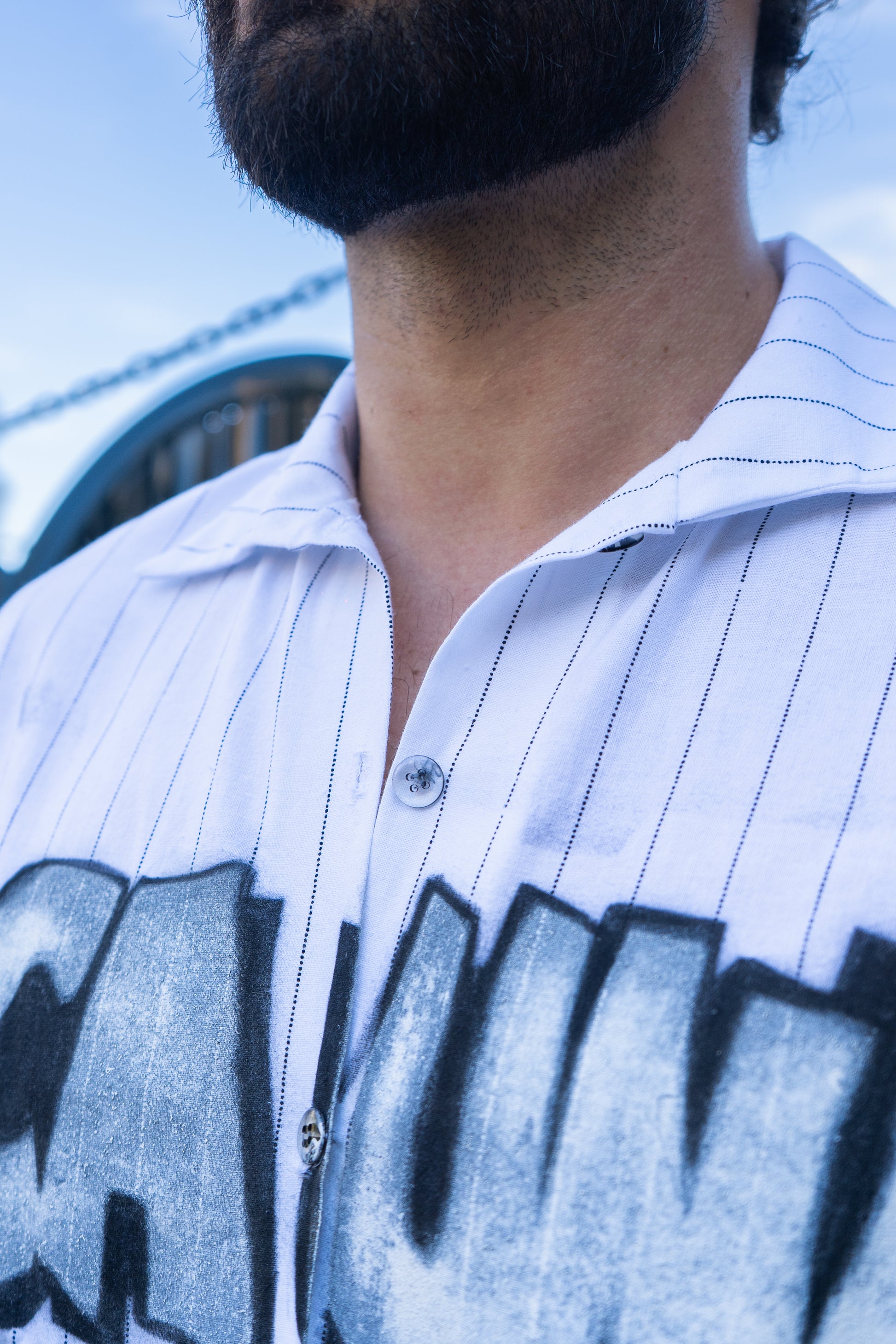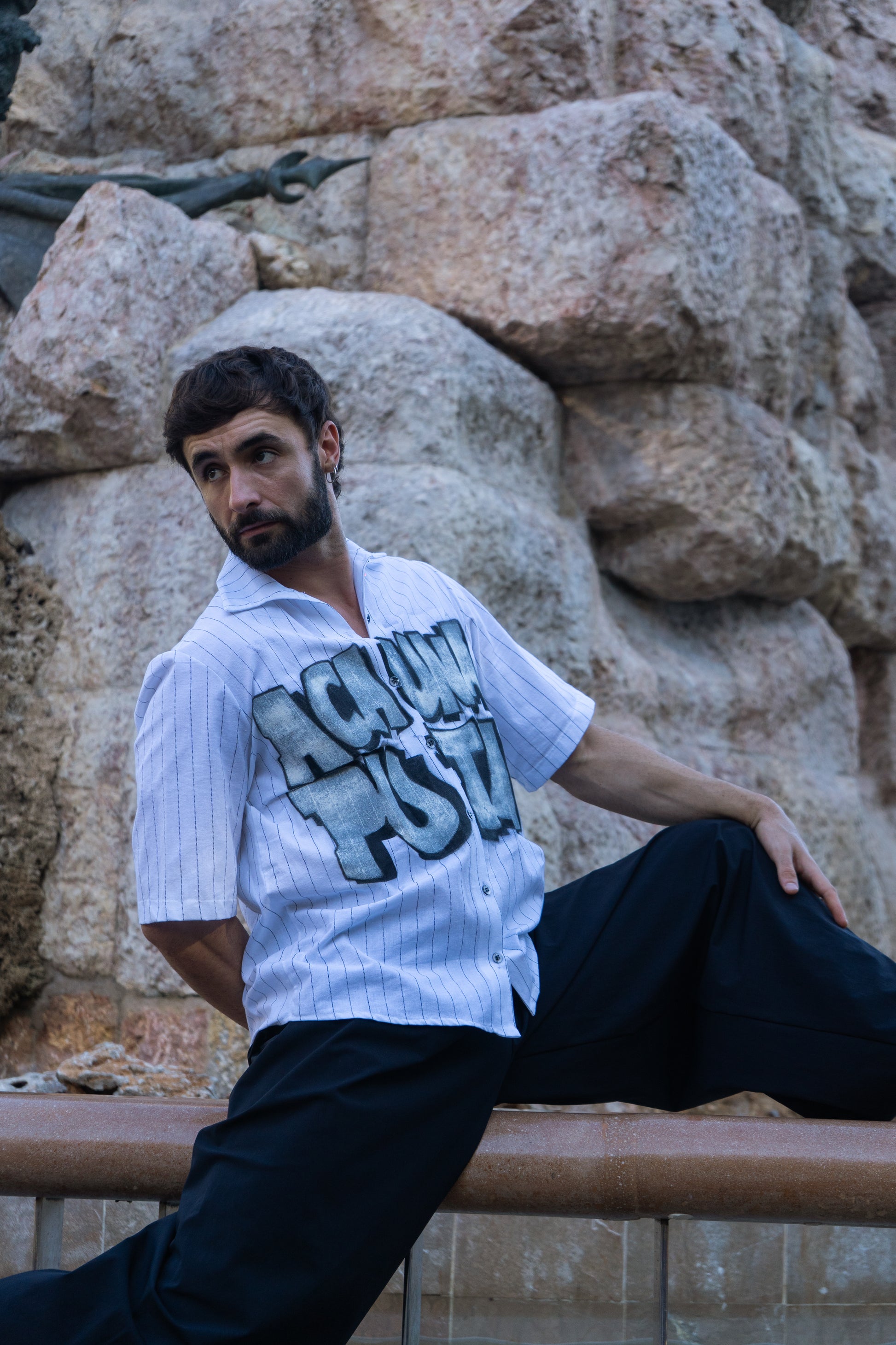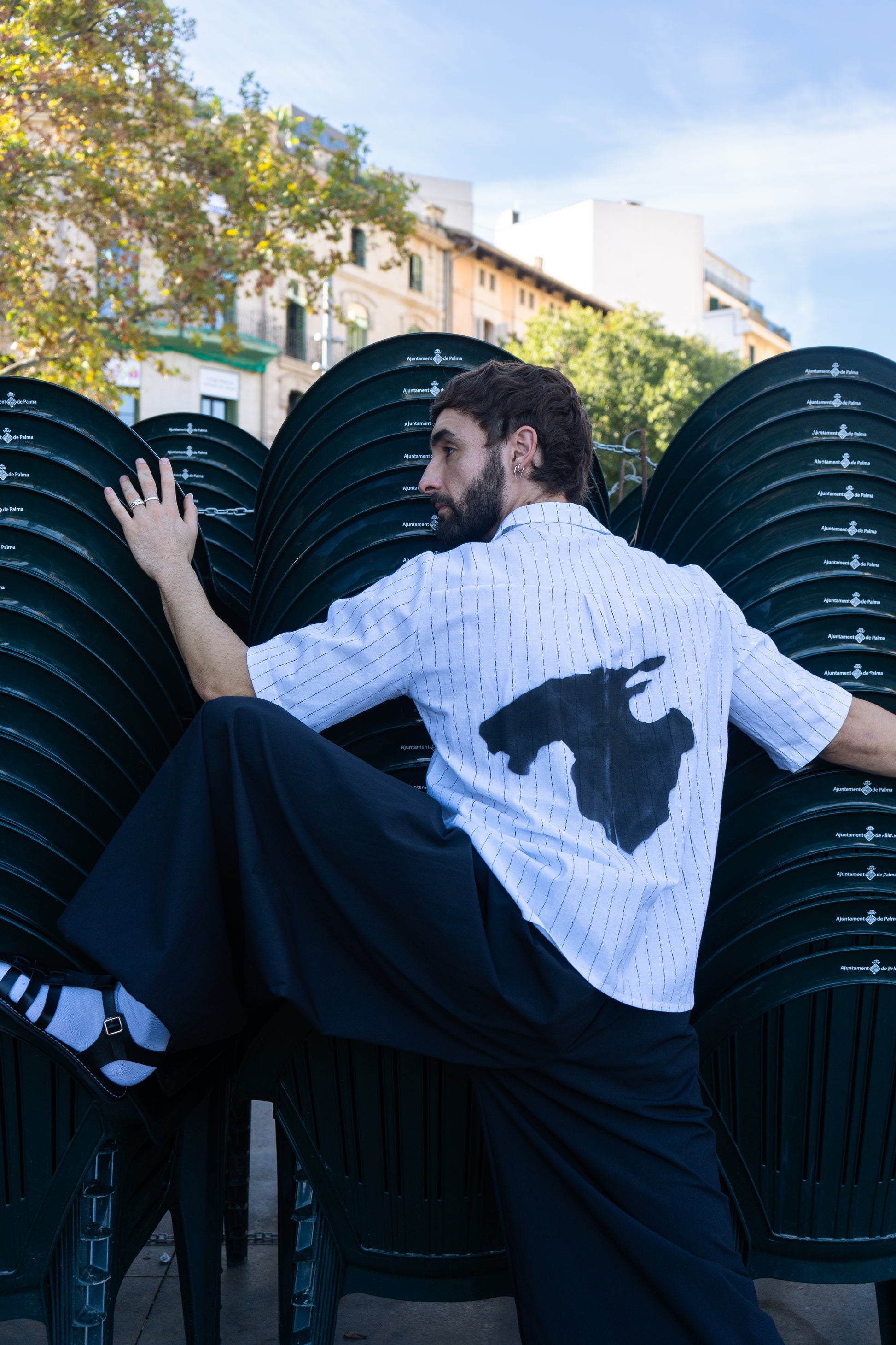 Camisa estilo béisbol blanca con rayas negras. Estampado en el delantero: A CA UNA PUTA y en parte trasera la isla de mallorca, pintado a mano por el artista Biel Torelló. Talla M ligeramente oversize.