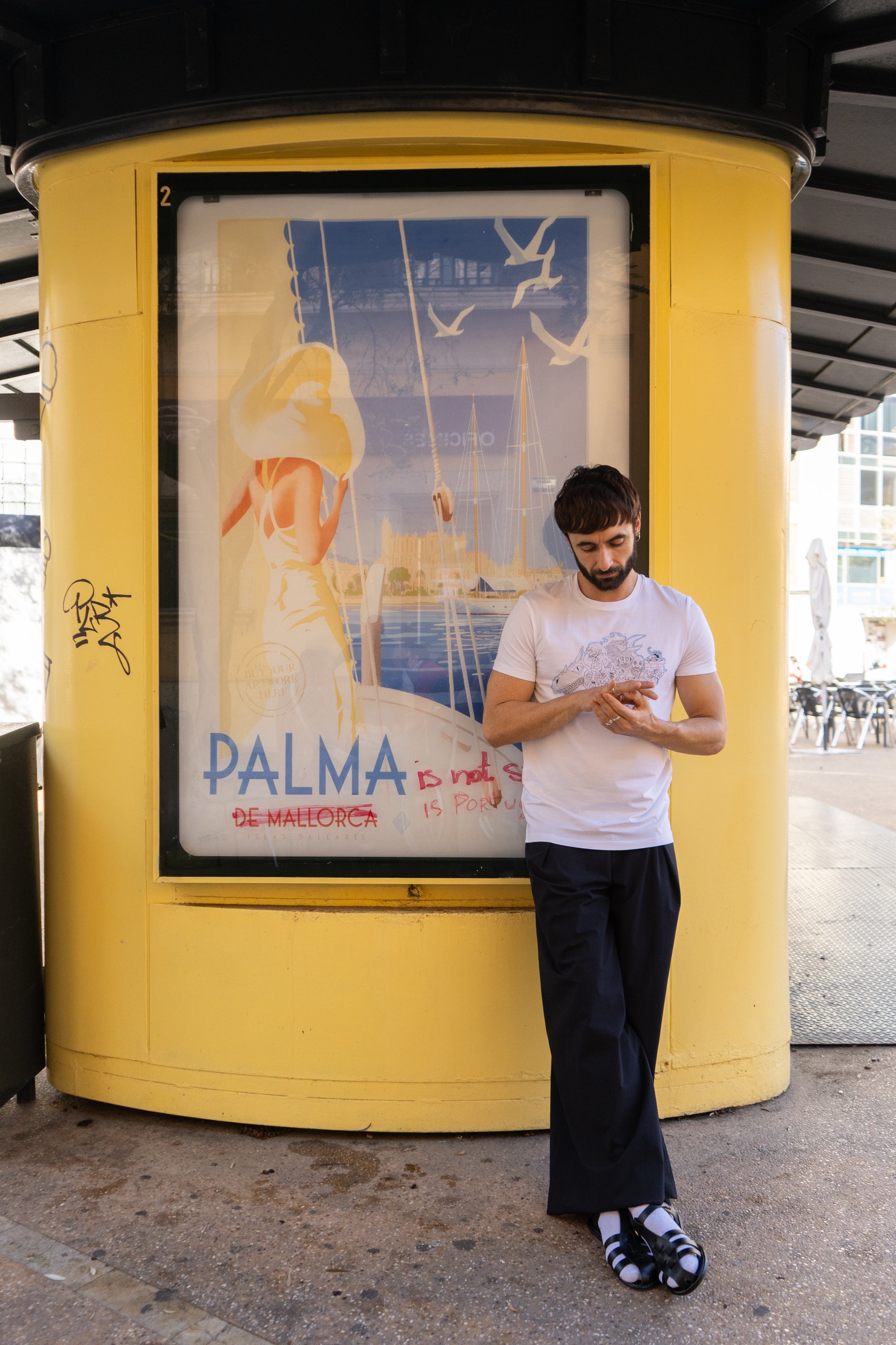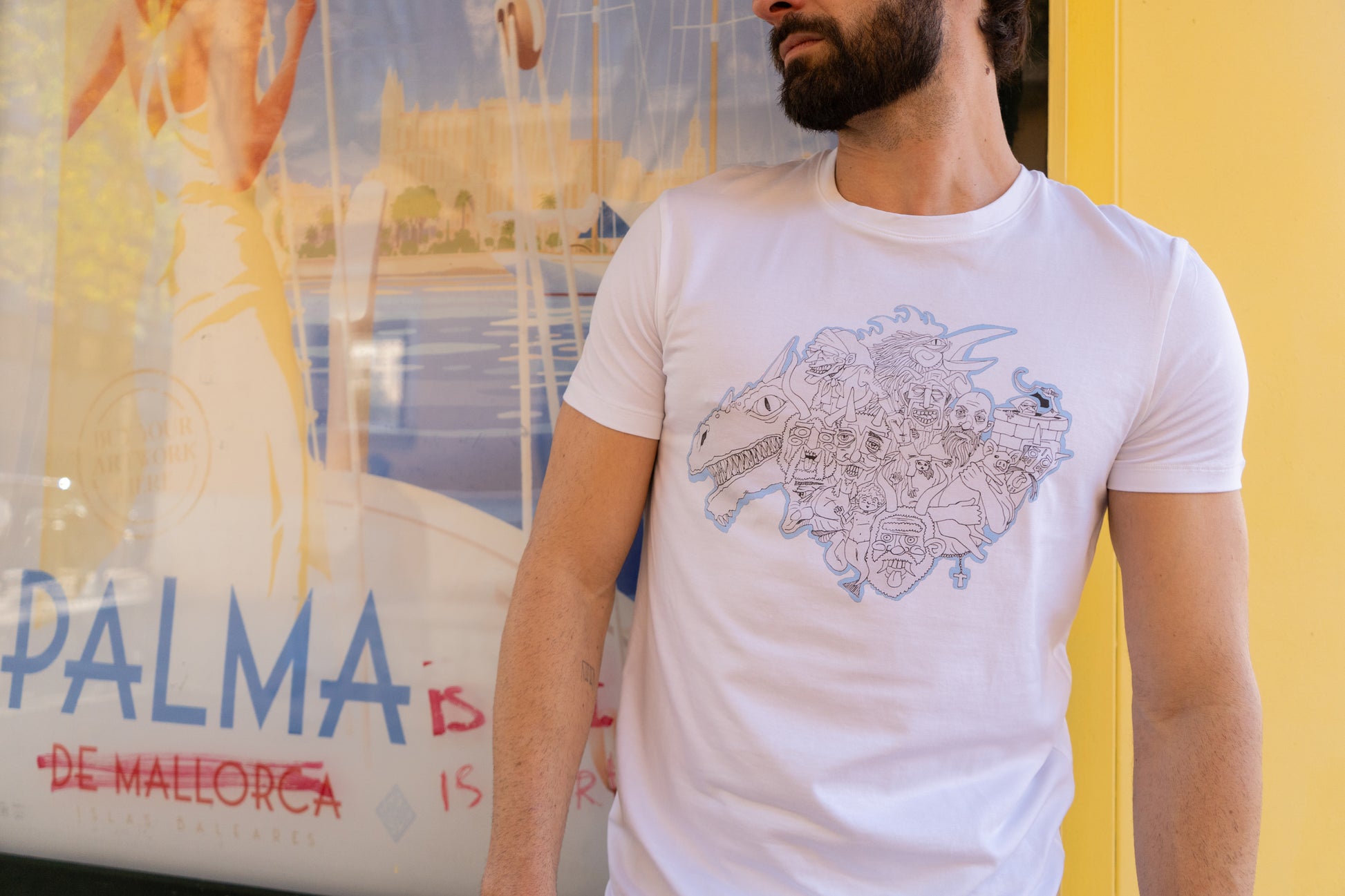 Camiseta con estampado del artista Biel Torelló. Este dibujo central, plasma las tradiciones y fábulas de Mallorca. Talla XS, S, M, L, XL. Tejido de algodón.