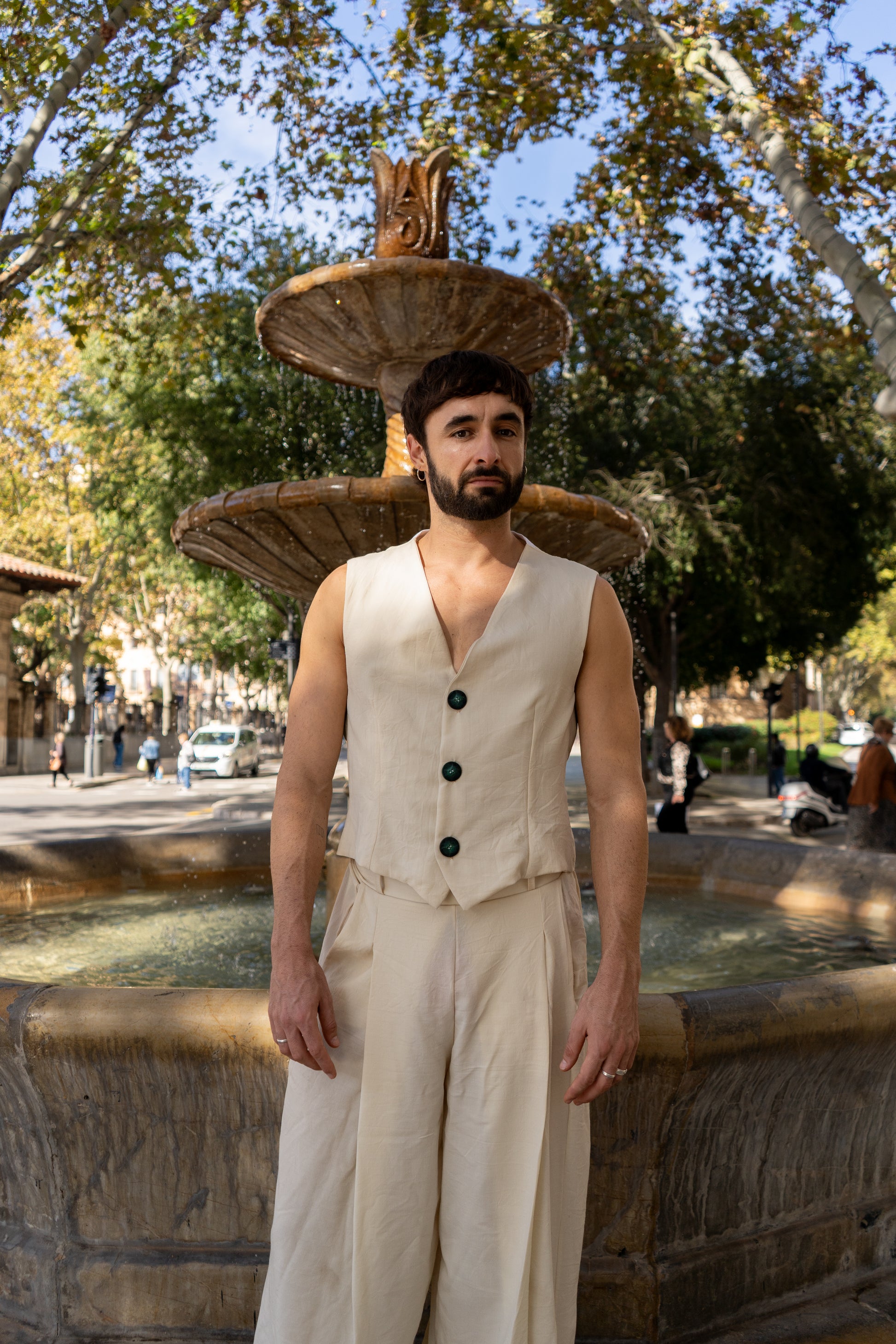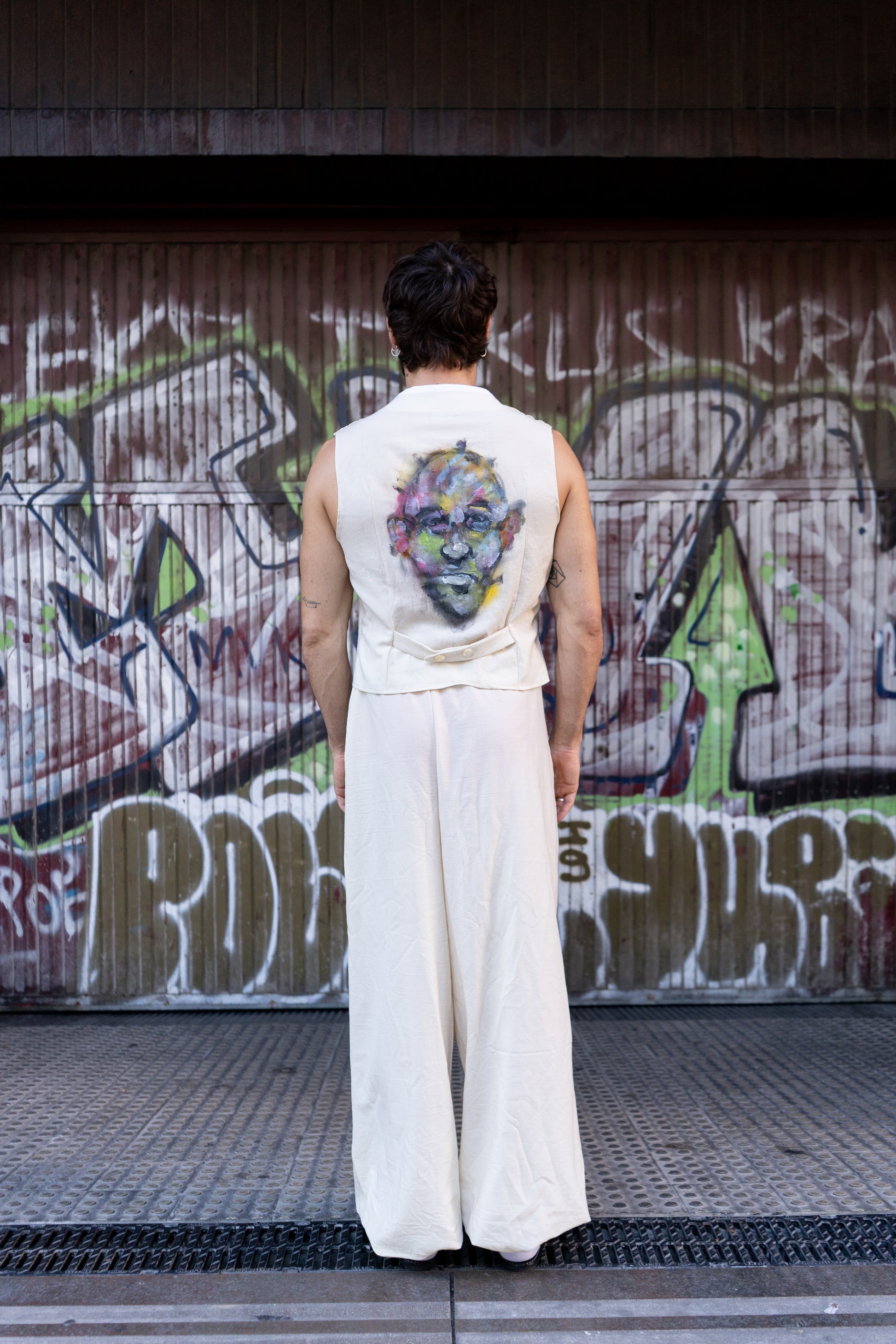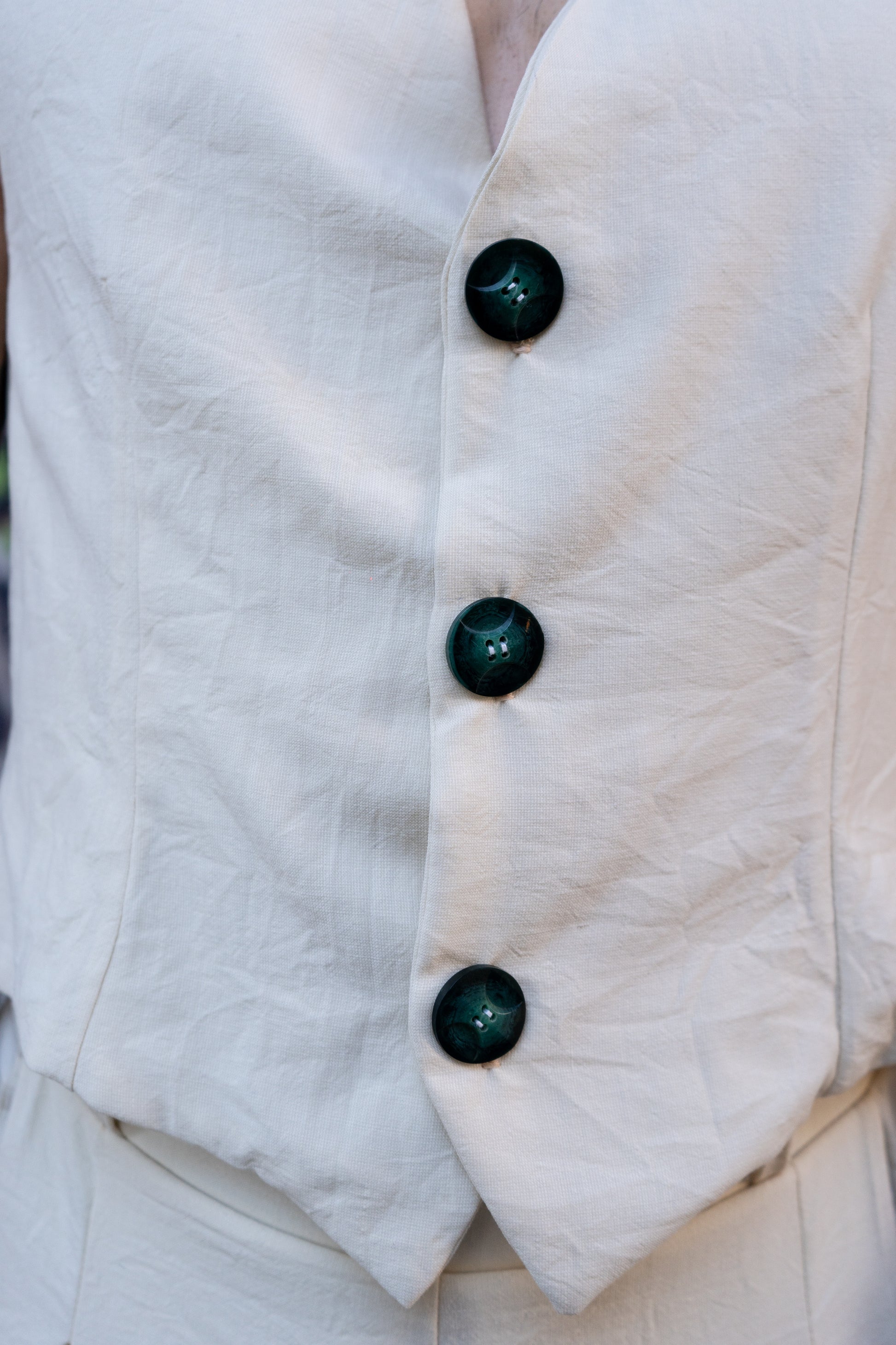 Chaleco entallado en hilo y algodón. Cierre con tres botones centrales delanteros y travilla en la parte posterior. Estampado hecho a mano del artista Biel Torrelló en la parte posterior.