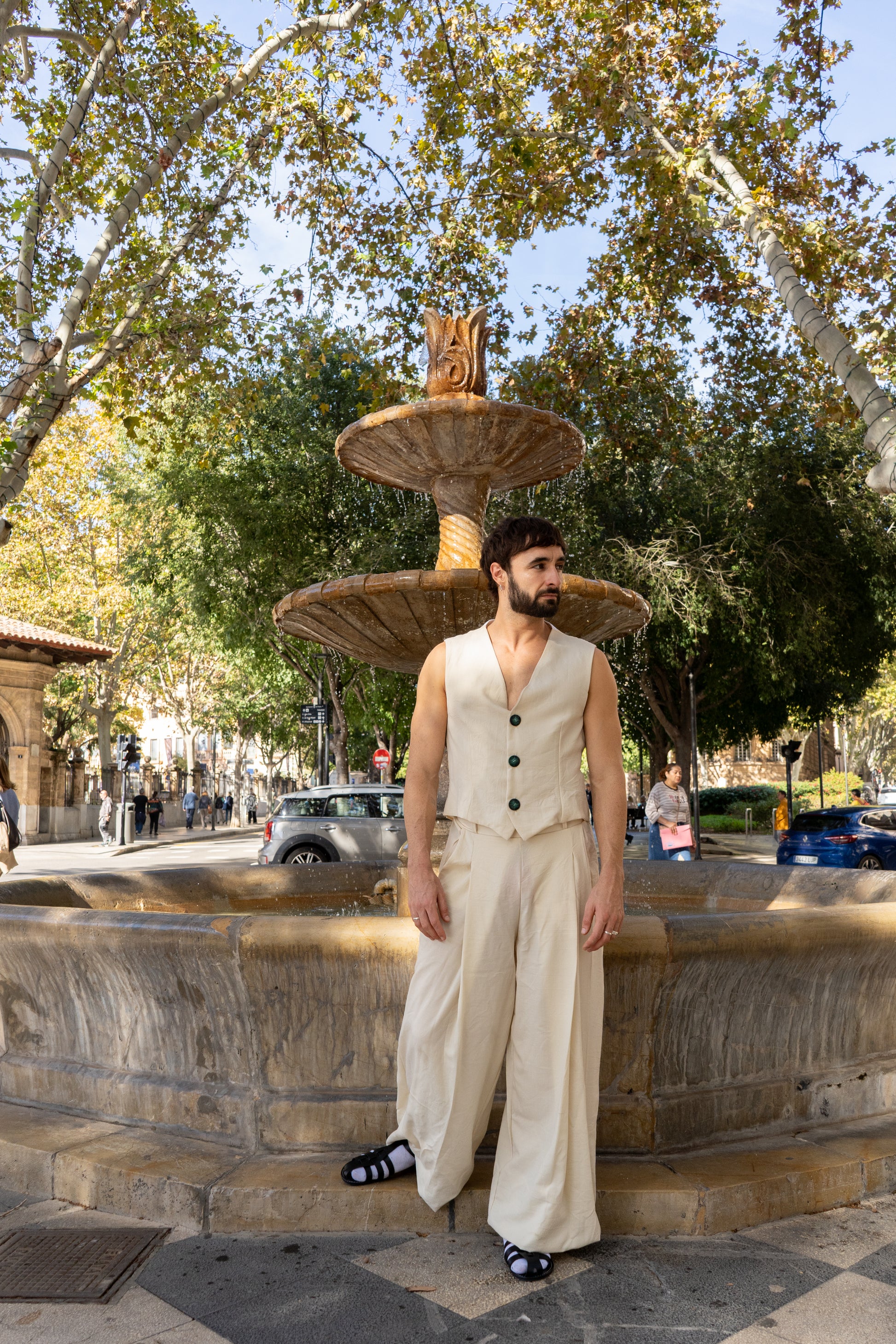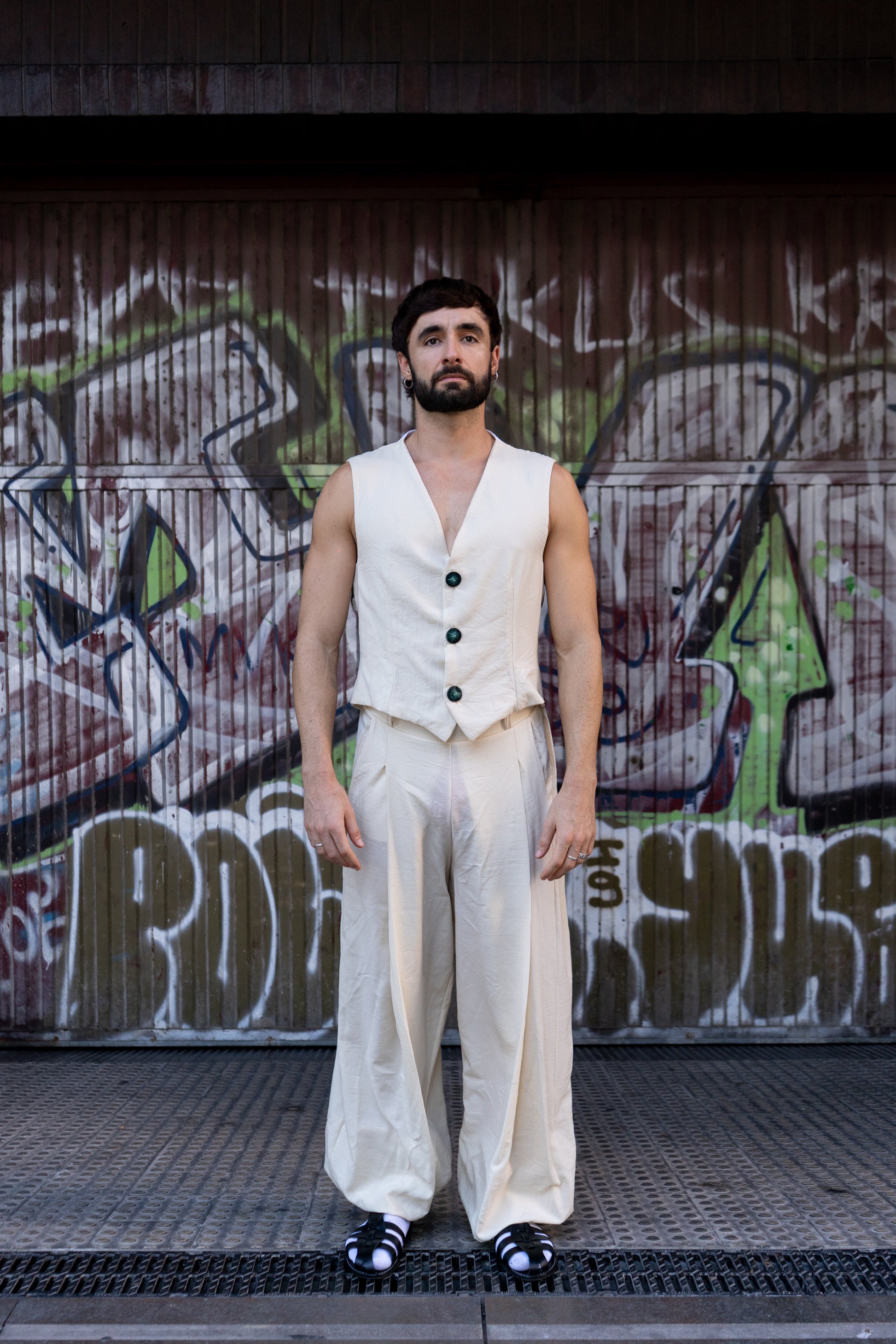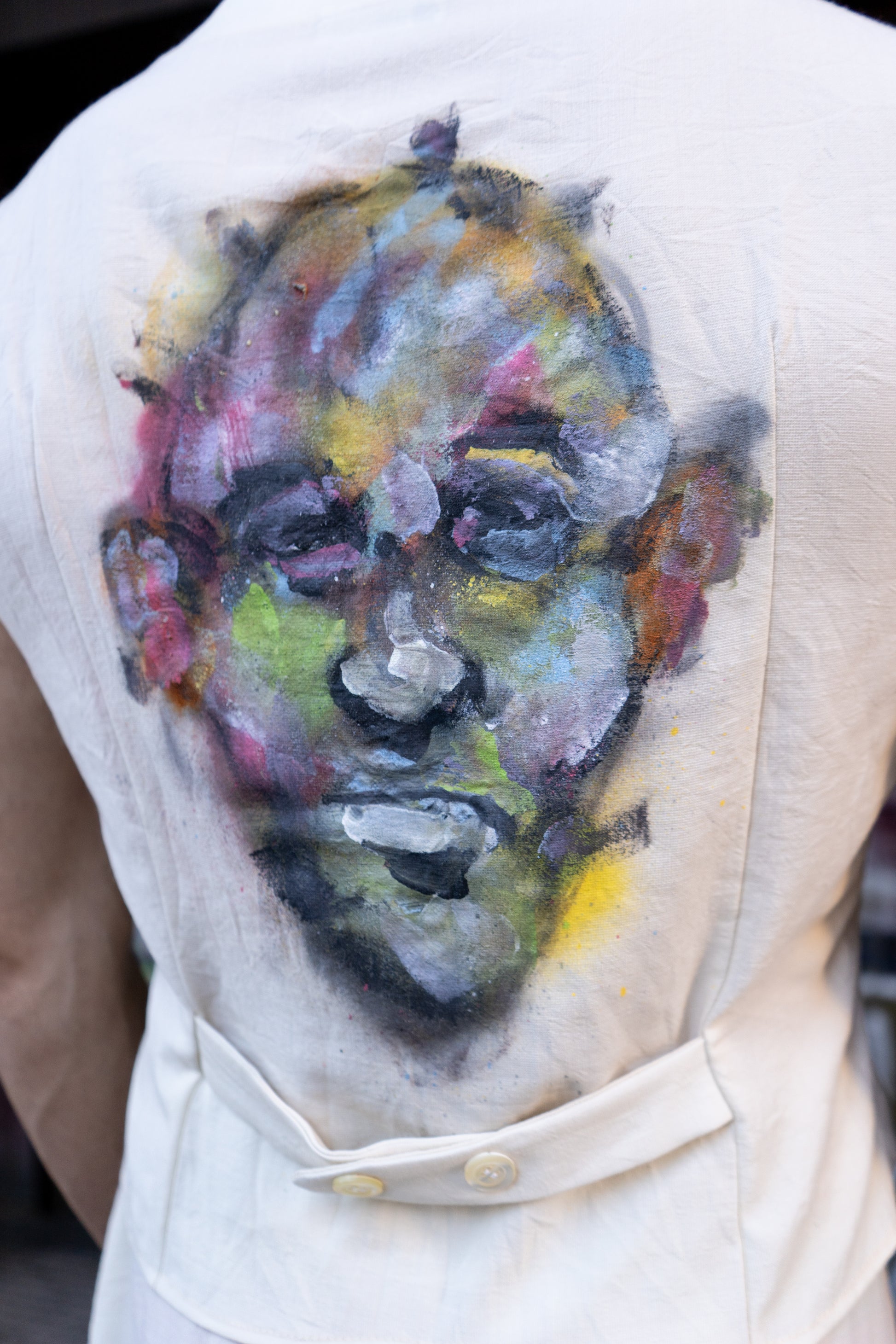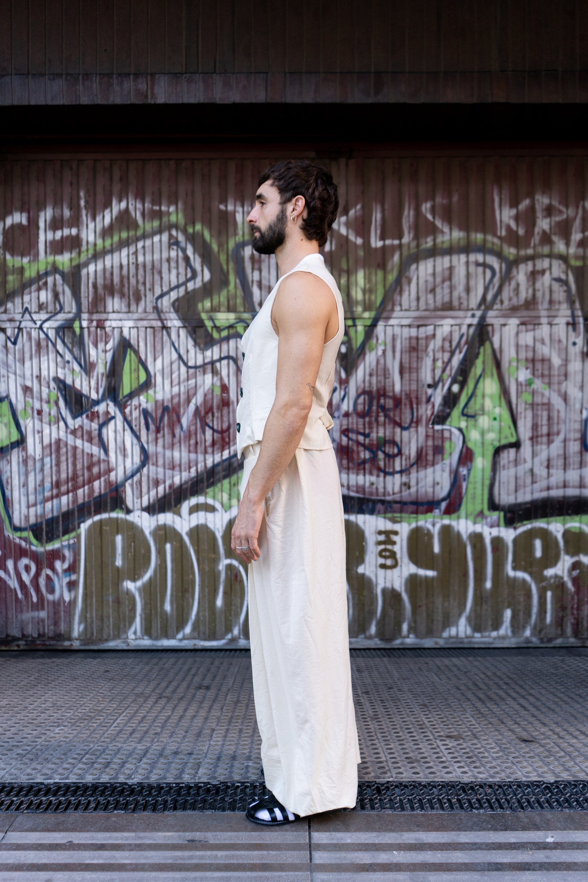 Chaleco entallado en hilo y algodón. Cierre con tres botones centrales delanteros y travilla en la parte posterior. Estampado hecho a mano del artista Biel Torrelló en la parte posterior.