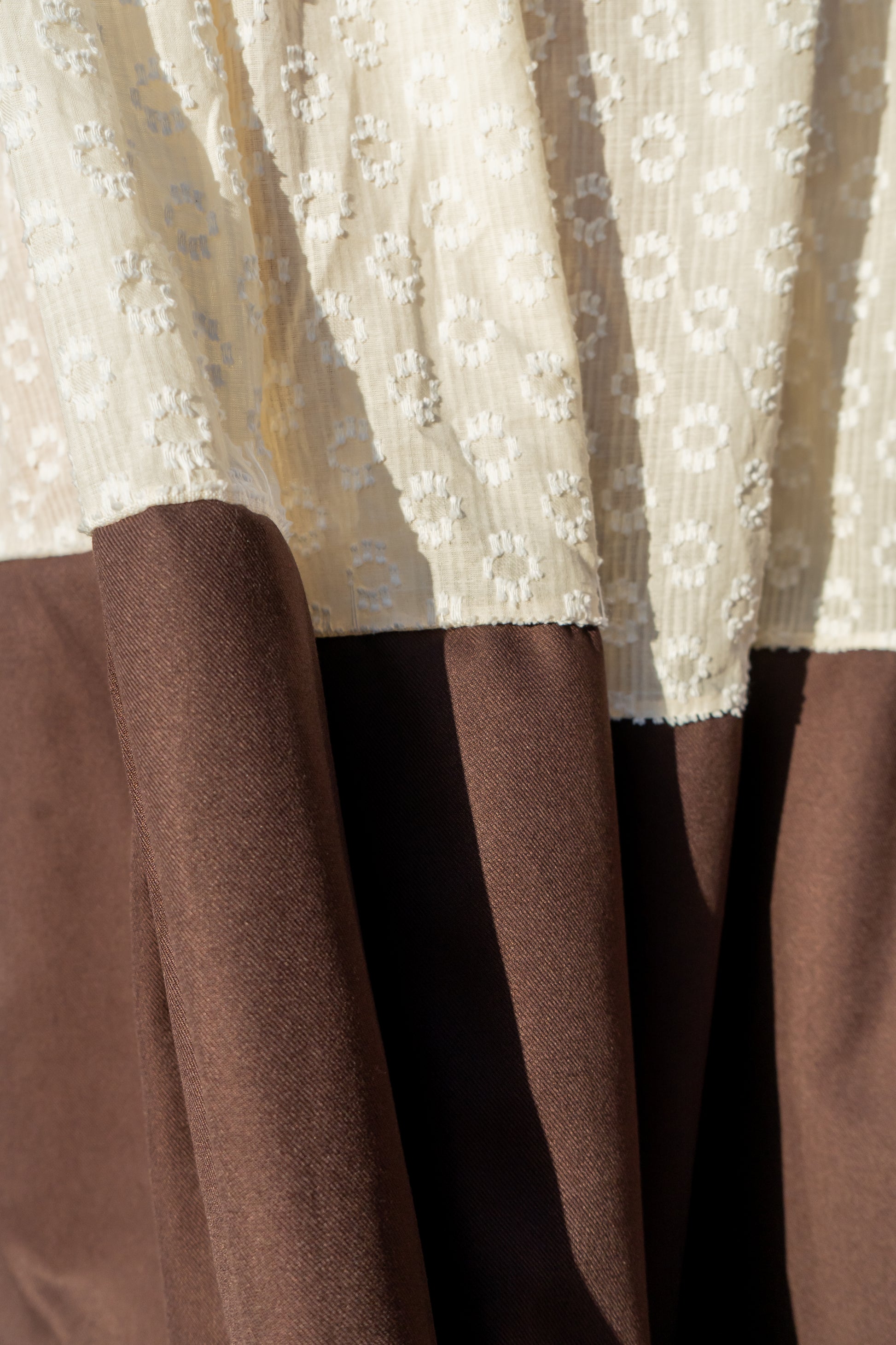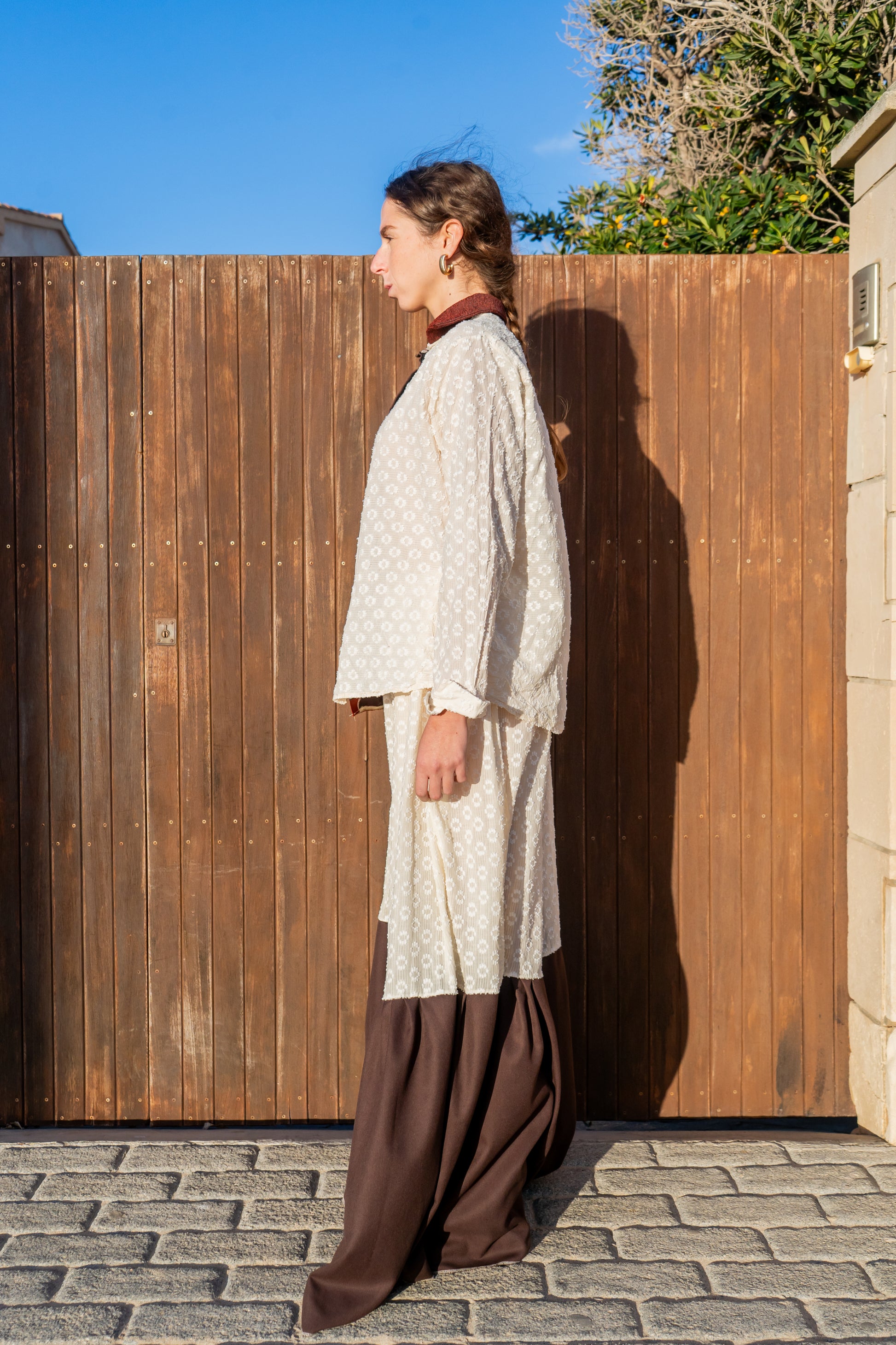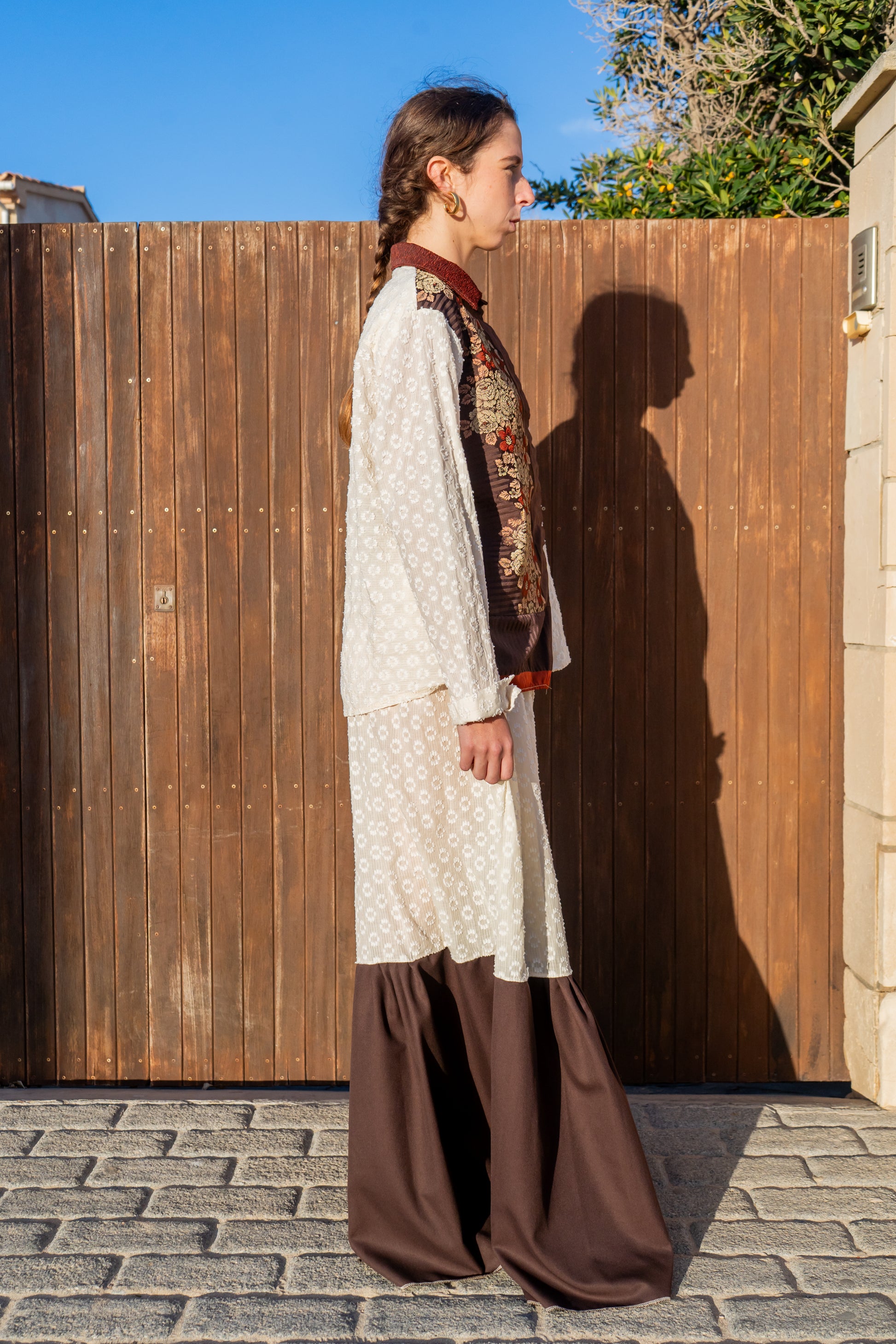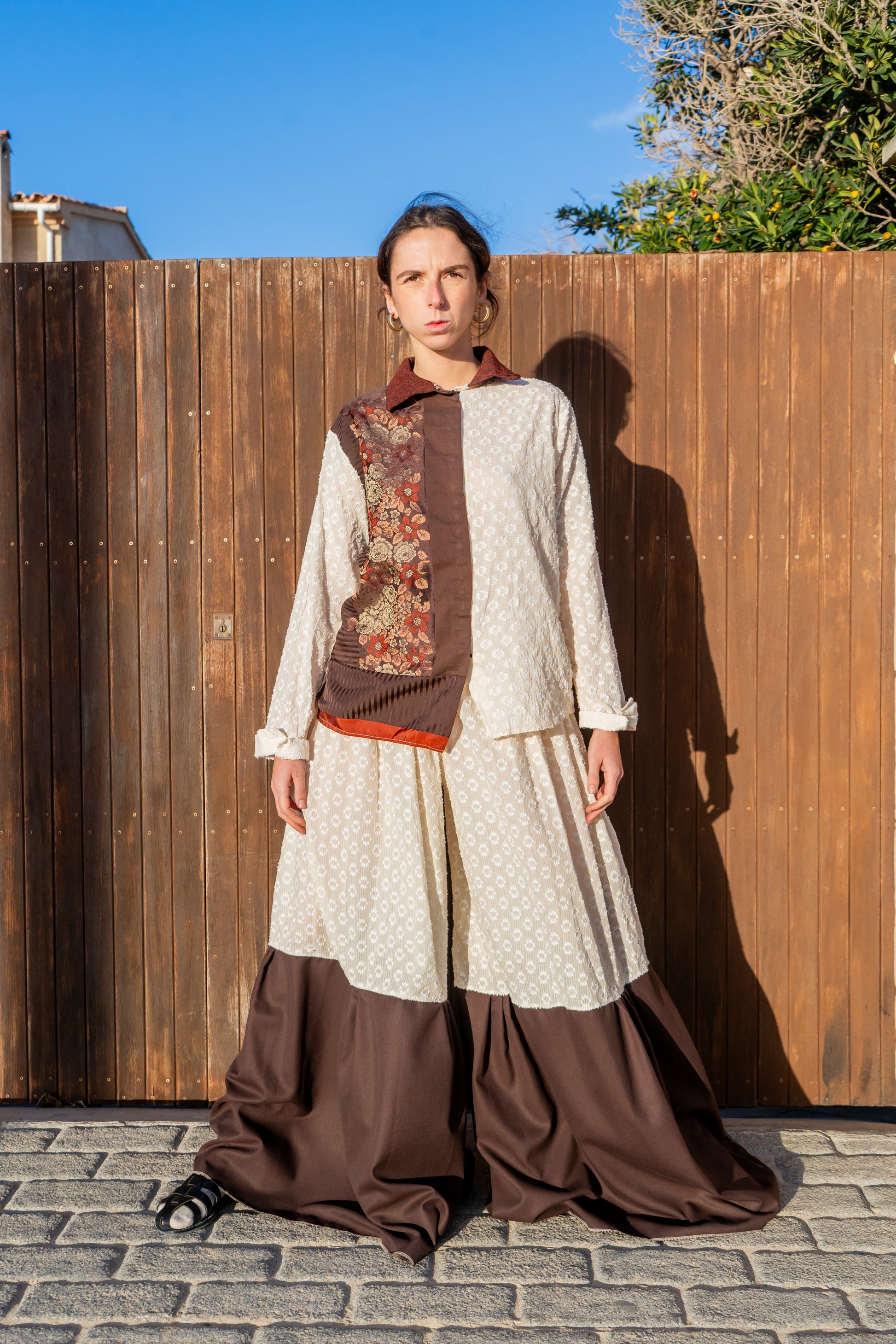 Pantalones de corte amplio que evocan la silueta de una falda, reinterpretando la tradición mallorquina desde un enfoque contemporáneo. Confeccionados en dos tejidos que remiten a las faldas tradicionales de la payesa, combinan textura y movimiento, creando una pieza que es a la vez cómoda y cargada de identidad. Se ajustan suavemente en la cintura mediante un elástico fino, adaptándose al cuerpo sin perder fluidez.