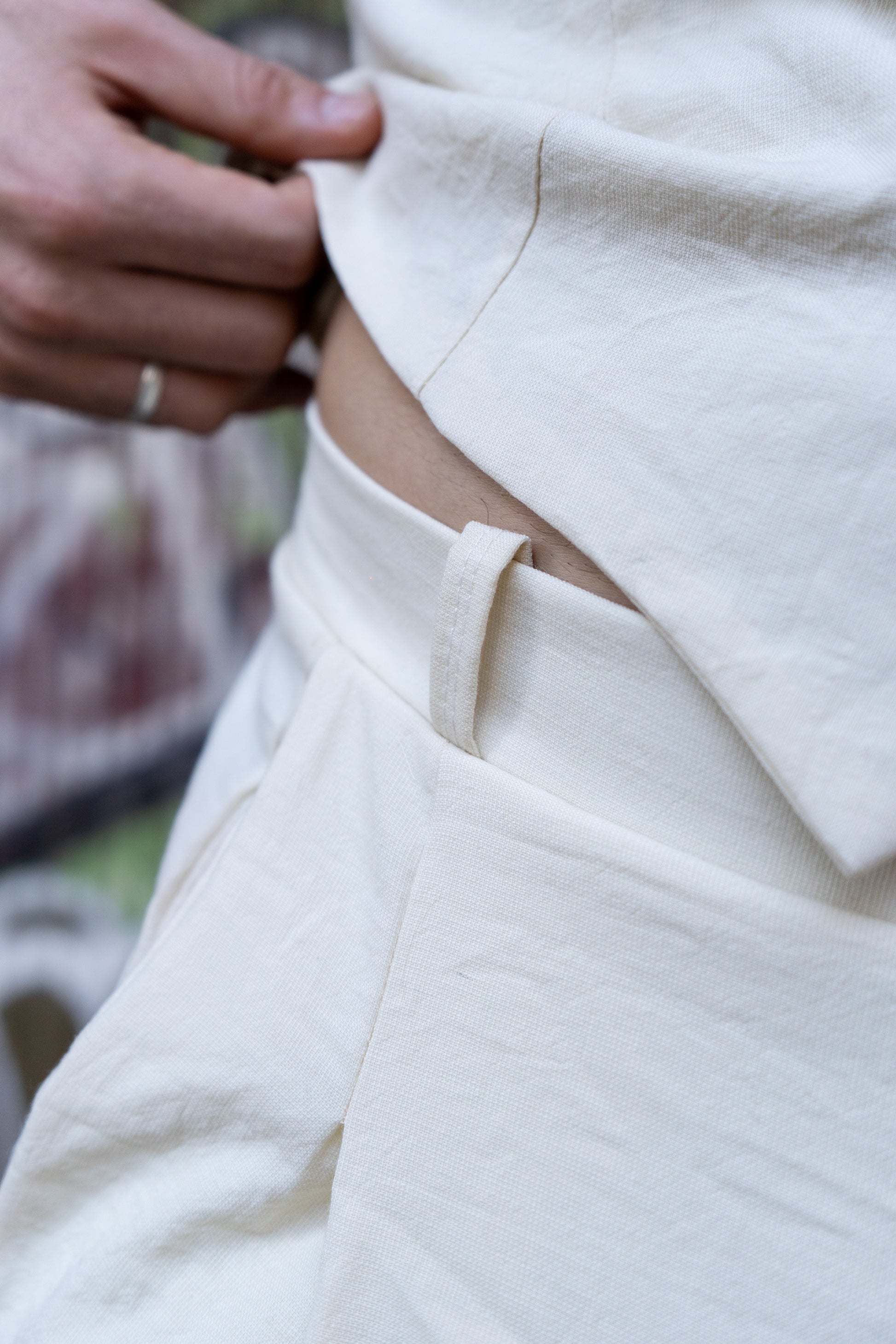 Pantalón pinzas con elástico trasero. Tejido hilo y algodón. Detalles: trabillas y bolsillos delanteros.