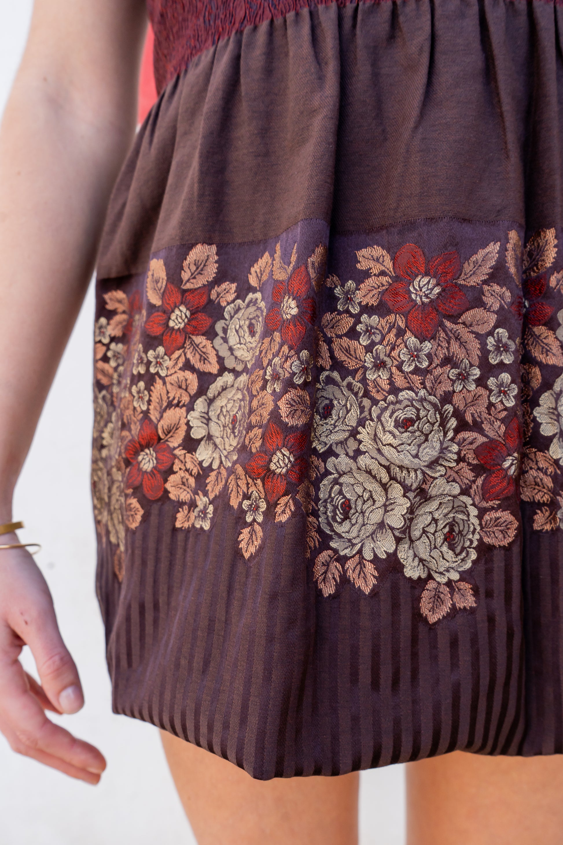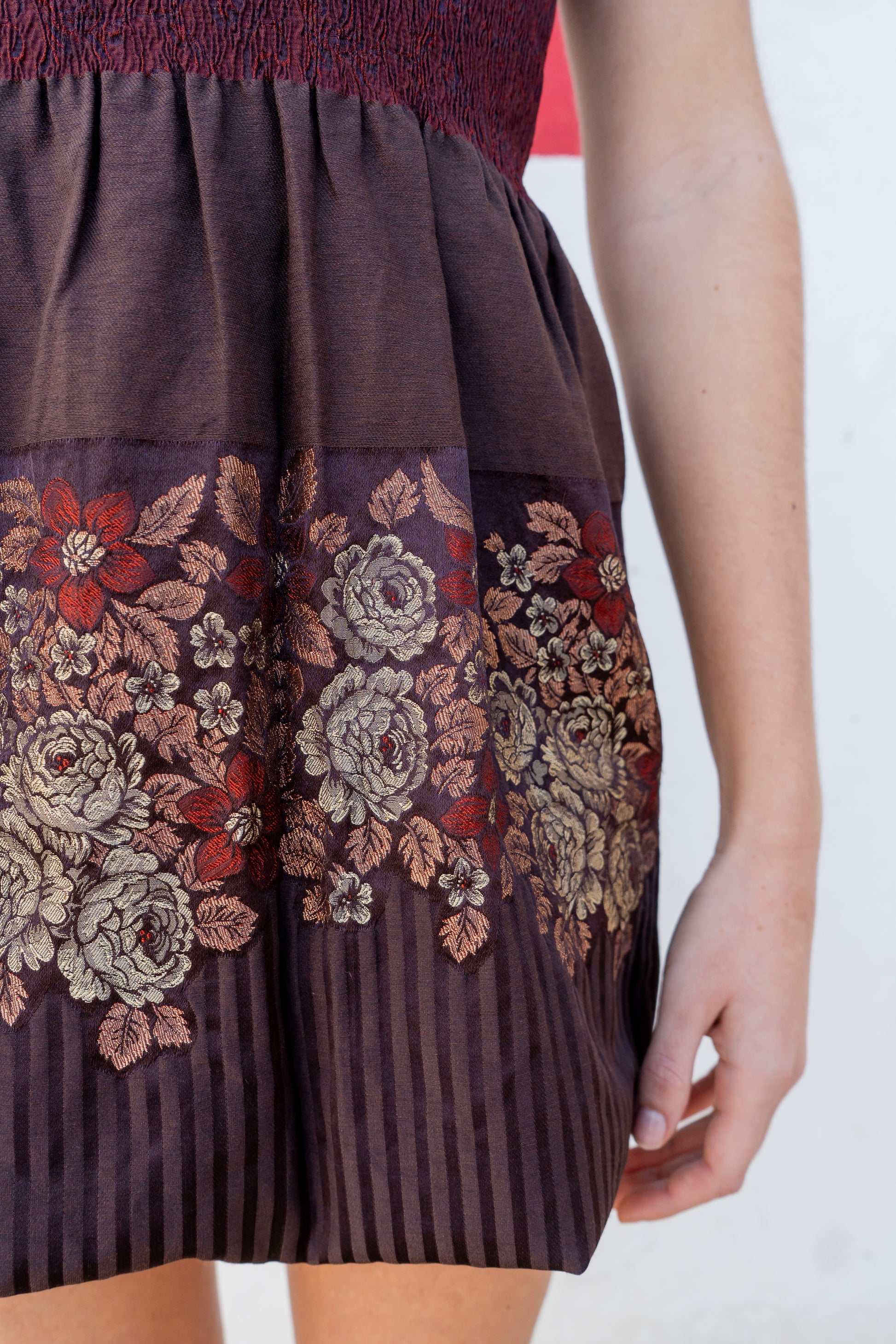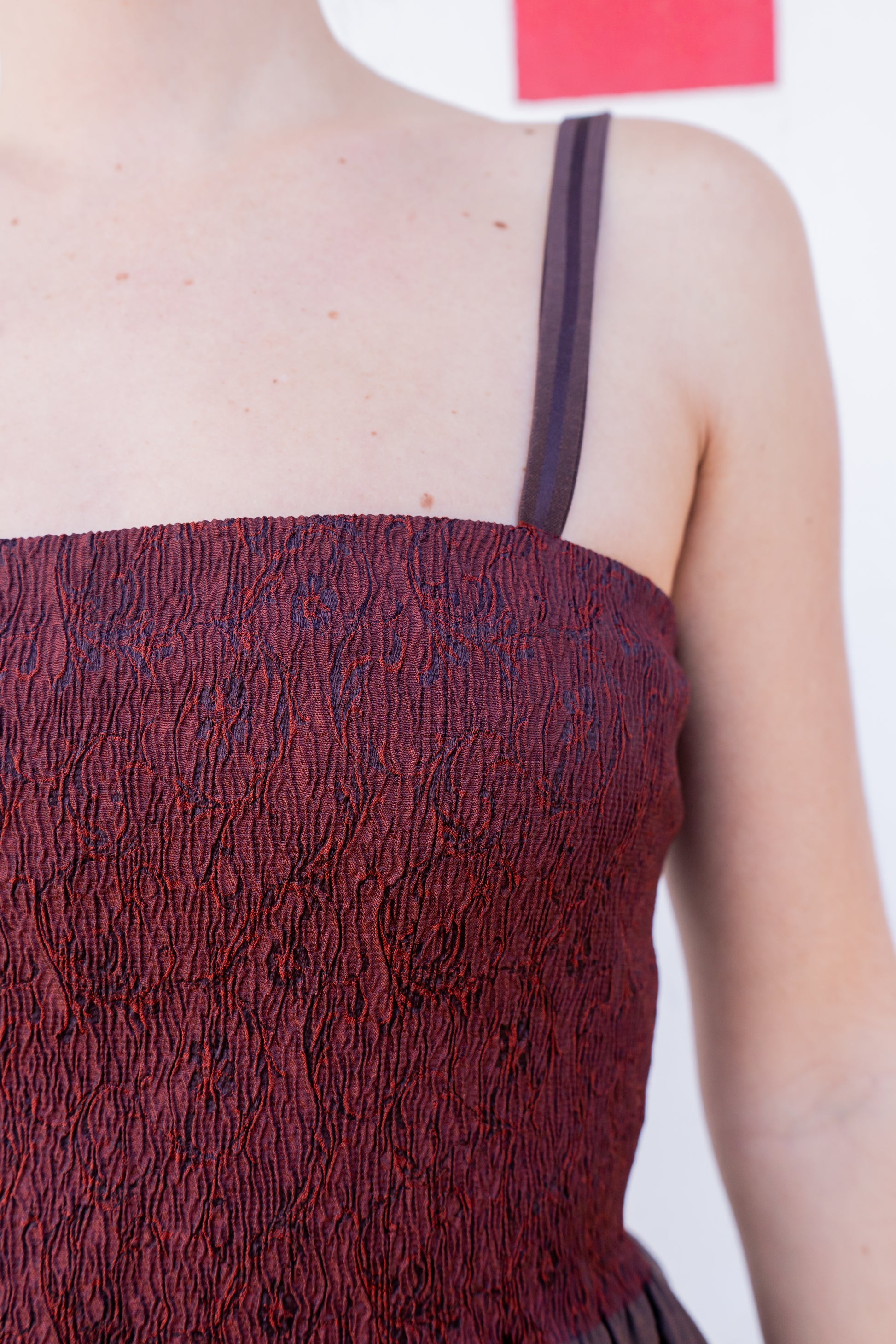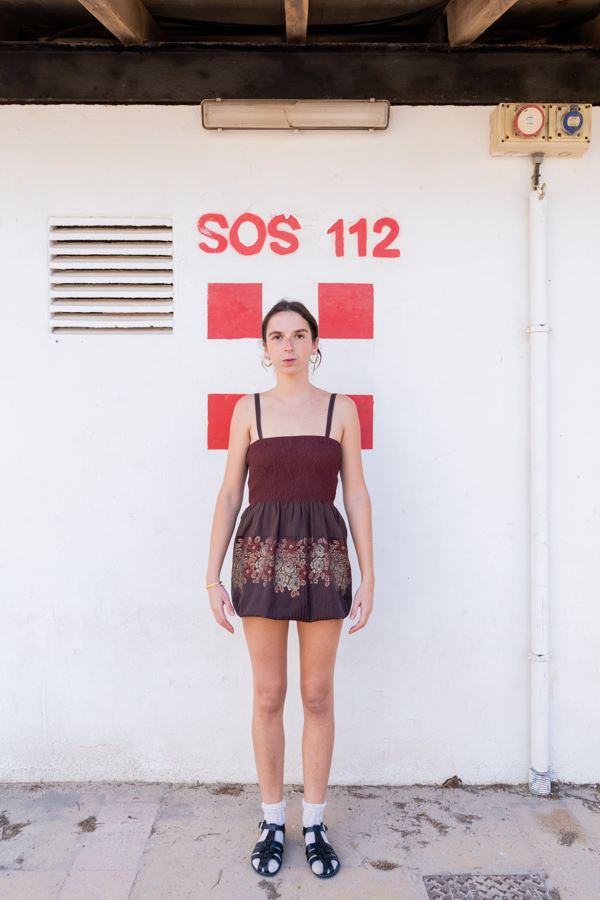 Mini vestido inspirado en la payesa mallorquina, reinterpretando la tradición desde su esencia más pura. Confeccionado en un tejido que recuerda la indumentaria tradicional mallorquina, el vestido presenta un corte entallado en el pecho con tirante fino, seguido de un pequeño globo en la parte inferior, que aporta movimiento y frescura. Su longitud corta refuerza la modernidad de la pieza, manteniendo un guiño a los orígenes.